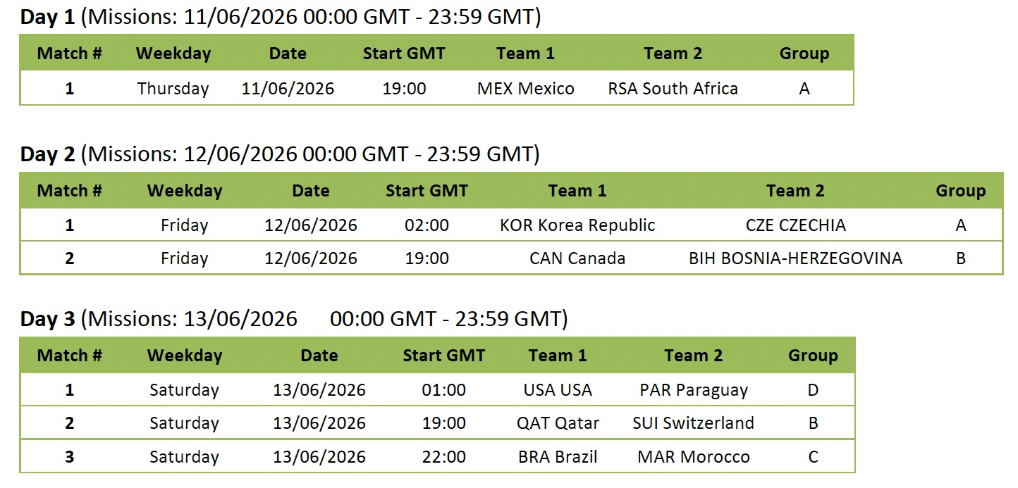 - Mission Qualification Periods: 11/06/2026 - 19/07/2026 (noncontinuous). Non‑continuous” means missions will only be visible and available on match days.