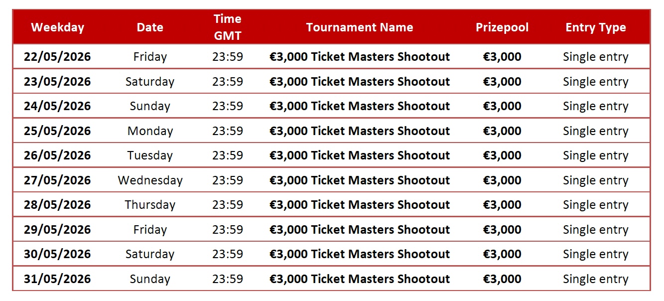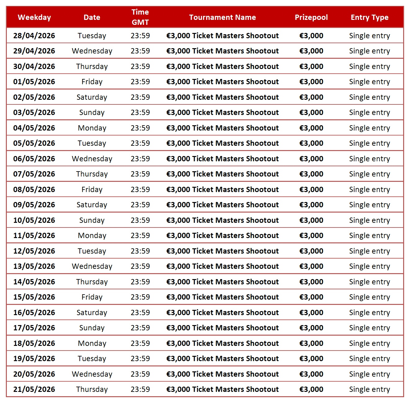 - "€3,000 Ticket Masters Shootout” freeroll entry tickets expire on 01/06/2026.