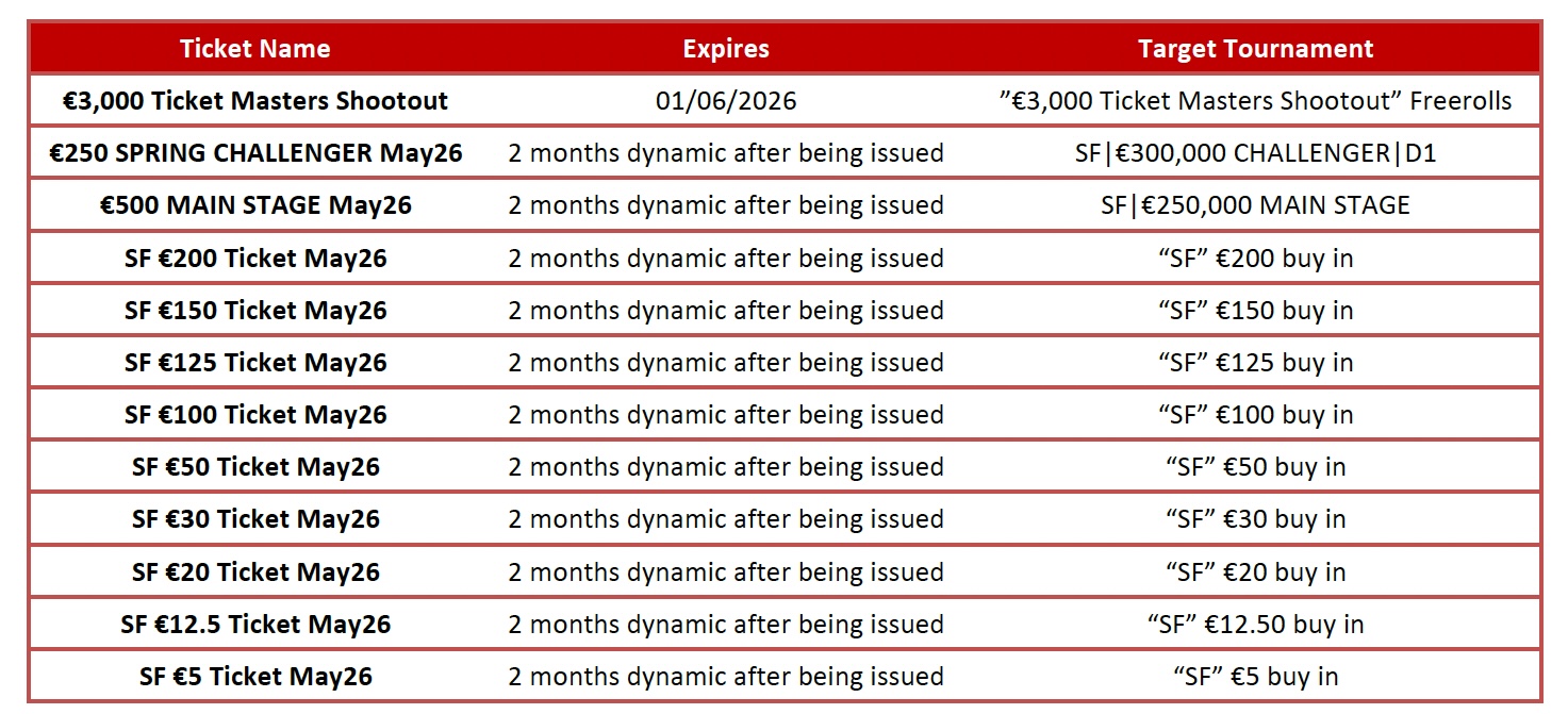 - “SF €XXX Ticket May26”, “€500 MAIN STAGE May26” and “€250 SPRING CHALLENGER May26” entry tickets are valid only in “SF” tournaments during the €10,000,000 GTD Spring Festival (running from 01/05/2026 – 08/06/2026) and expire 2 months dynamic after having been issued. On 16/01/2026 they will be linked to all tournaments.